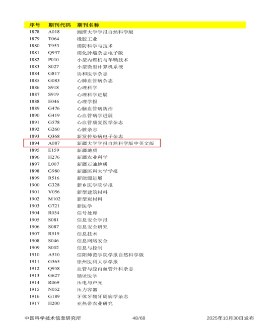 2025年10月30日,中国科学技术信息研究所发布《中国科技核心期刊目录(2025年版学术卷)》,《新疆大学学报(自然科学版中英文)》自2021年起连续入选。